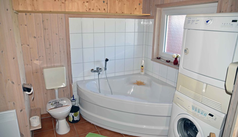 Im Badzimmer befindet sich zudem eine Waschmaschine und ein Trockner.