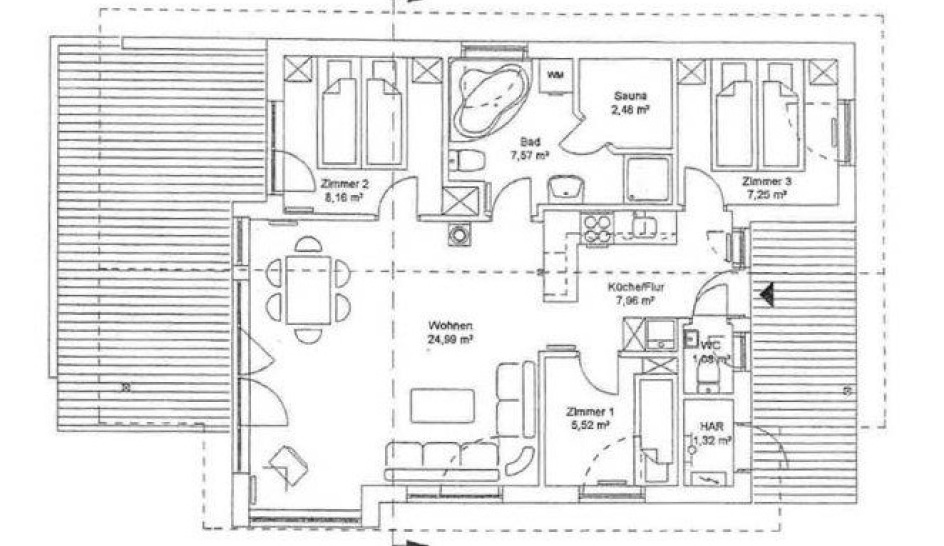 Ein Wohnbereich mit offener Küche und 3 Schlafzimmern lädt zum Urlaub ein. Die große Terasse ist vom Wohnbereich direkt zugänglich und in einem kleinen Schuppen kann man diverses verstauen.