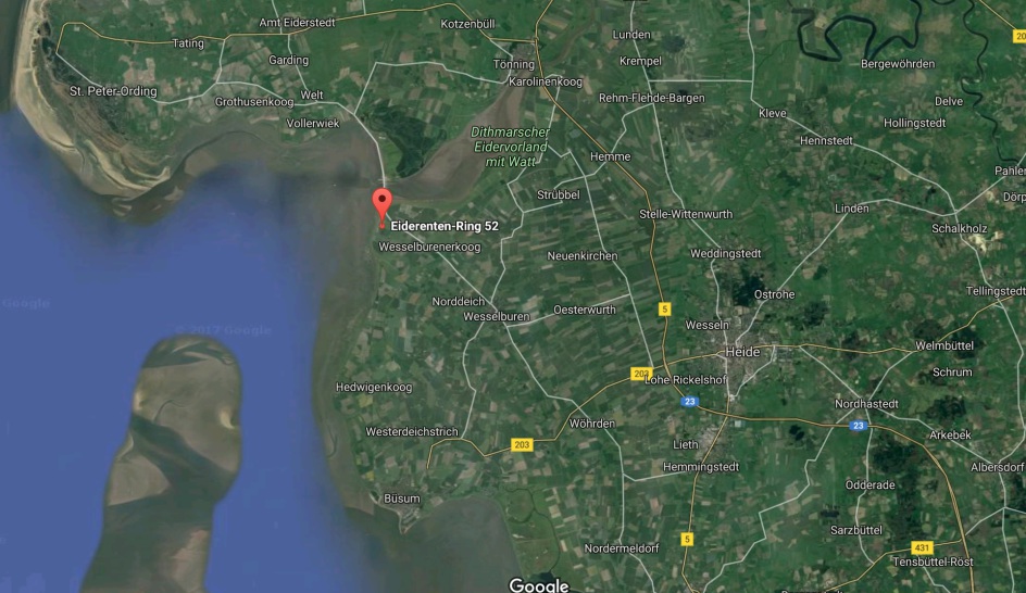 Mit dem Flugzeug bitte ungefähr bei folgenden Koordinaten Breite 54.47876 / Länge 8.843419 mit dem Fallschirm abspringen und auf wenig Wind hoffen :-). Sie können sich Zeit lassen und die Fernsicht genießen, denn Wesselburenerkoog liegt nur 2 Meter über NN.